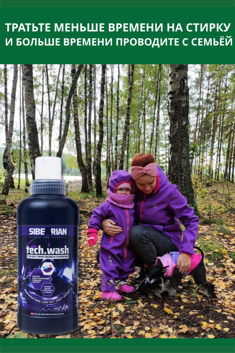Тратьте меньше времени на стирку, чтобы больше времени проводить с семьей. Гель для стирки мембранных тканей TECH.WASH бережно устраняет загрязнения с одежды из технологичных материалов: Gore-Tex, eVent, Softshell, NeoShell, Dermizax, Sympatex, и др.
